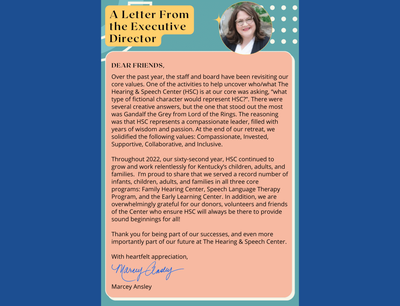 In 2020, in an effort to honor everyone served by the organization, the decision was made to change the name to The Hearing & Speech Center. The Hearing & Speech Center is proud to support individuals and families from over 70 Kentucky counties. The updated name and logo represent The Hearing & Speech Center’s commitment to all Kentuckians.